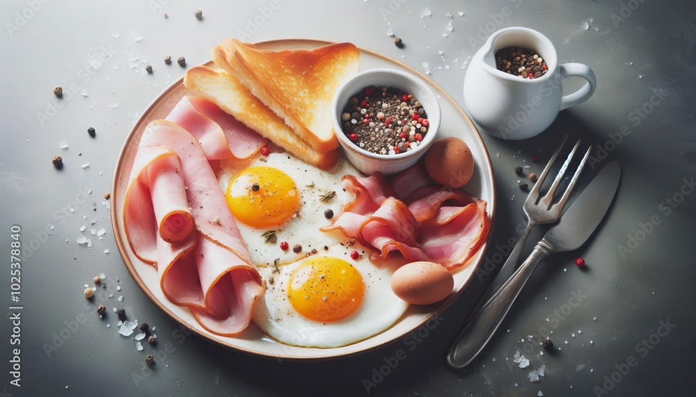 Ham and Eggs. Bacon and Eggs. Salted egg with pepper on white plate.