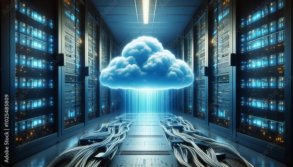 blue cloud hovers in the center of a server room, surrounded by computer servers and cables,