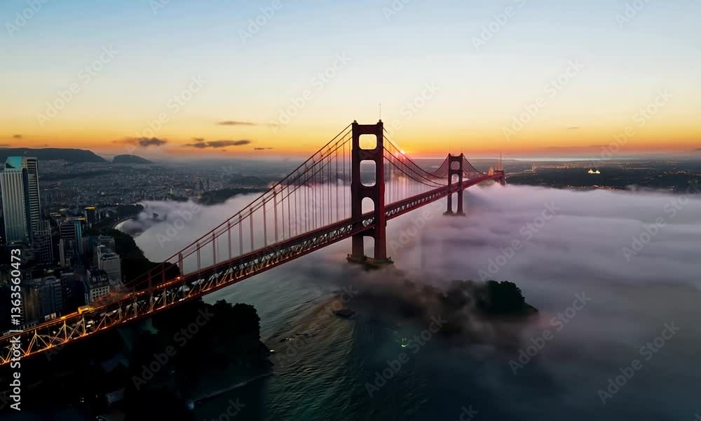 Drone view of the city, bay and big bridge covered with fog at sunset