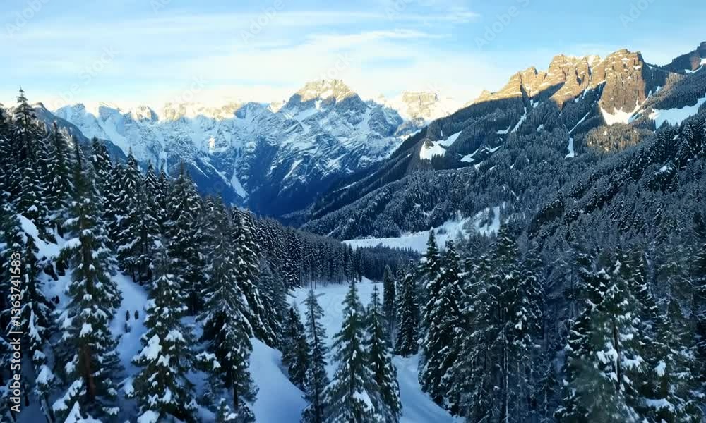 Flight through the winter forest in the mountains. Aerial view of Beautiful landscape of nature. 4K