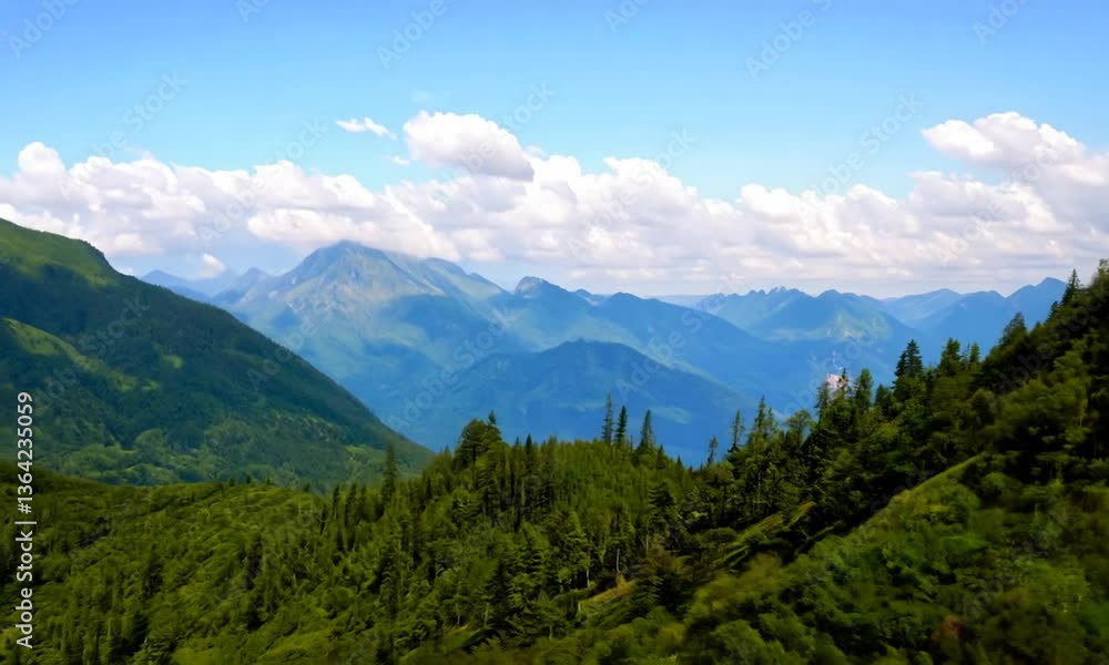 Green mountains beneath a bright blue sky with scattered clouds on a sunny summer day