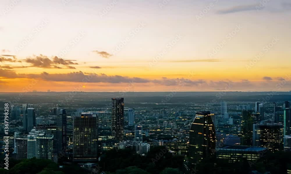 Sunset view over city skyline from rooftop with clouds and urban landscape