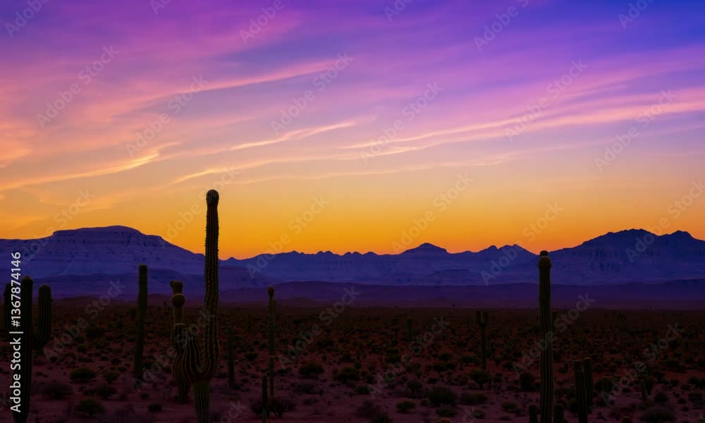 Sunset view of the Arizona desert with Saguaro cacti and mountains