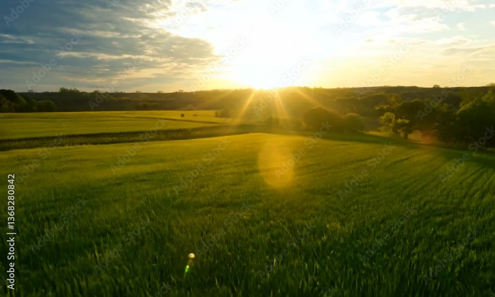 Green field at sunrise with blue sky