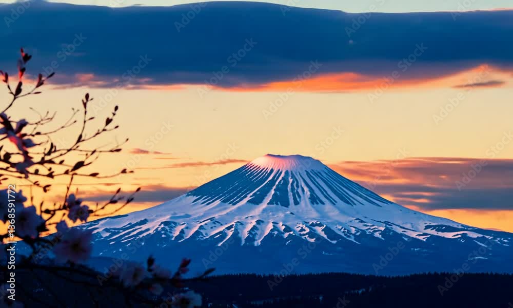 A vibrant sunset illuminates a snow-capped mountain, framed