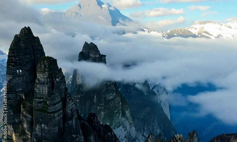 Aerial hyperlapse of high mountain peak with clouds in Dolomites, Italy