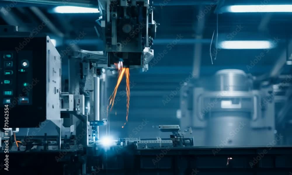 High tech industrial facility with robotic arms operating at night