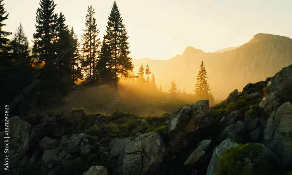 Majestic forest landscape with tall trees and rocky terrain in sunlight