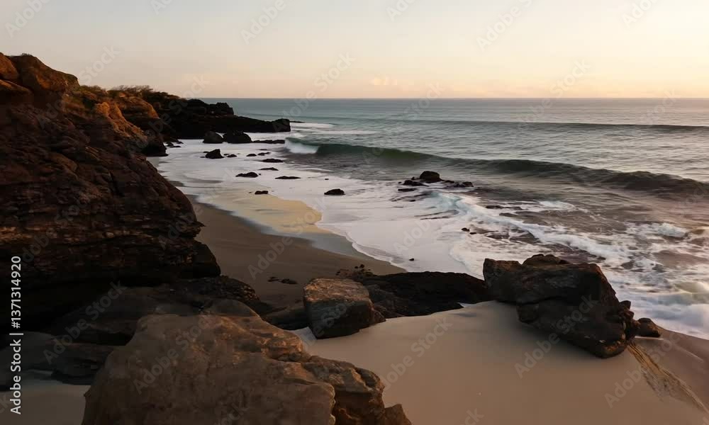 Sand beach among rocks at Atlantic Ocean coast in Portugal
