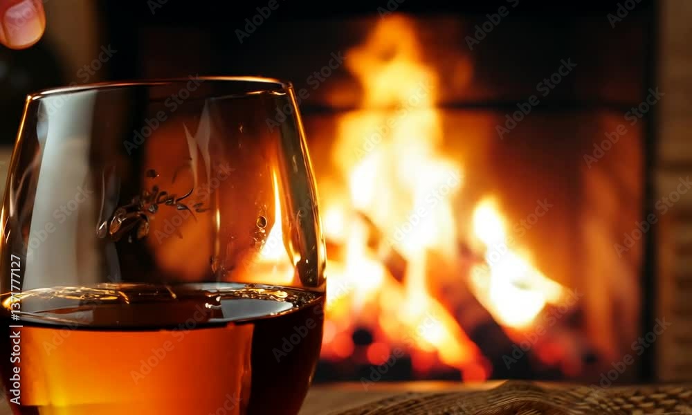 Glass with whiskey or cognac. Burning Fire In The Fireplace. Warmth and home comfort. 4K
