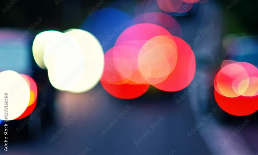 Blurred bokeh of cars in traffic on the road at night. Abstract bright blurred colored bokeh.