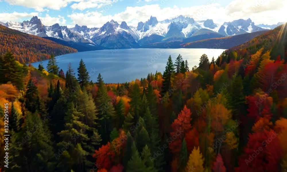 FPV Aerial view of colourful forest on mountain slopes and Harrison Lake. Canada