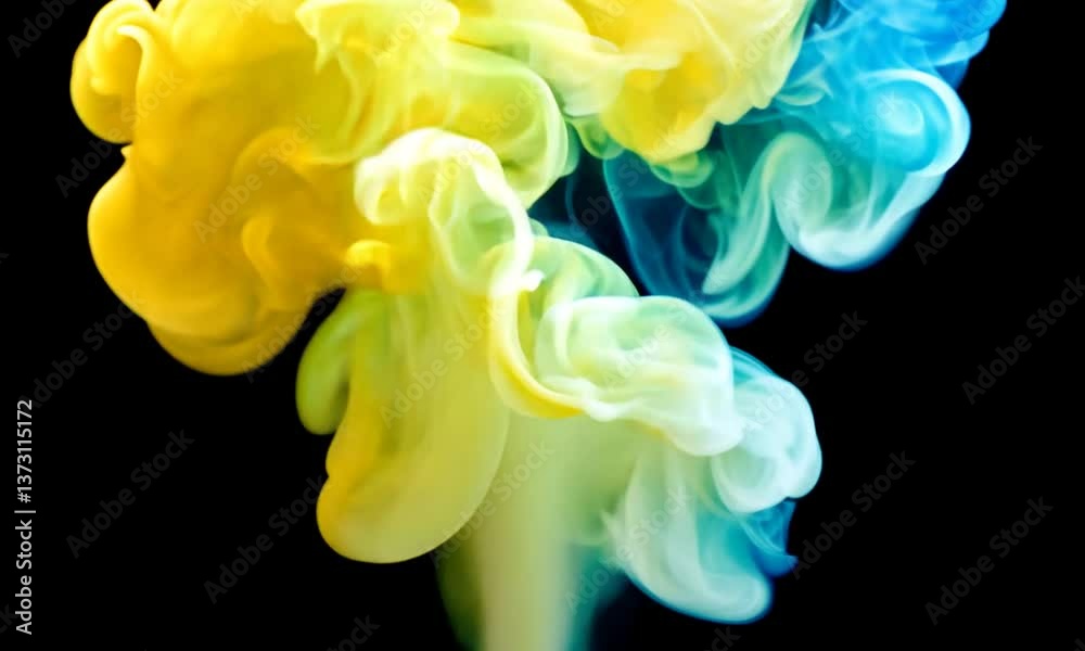 Yellow and blue colored smoke rising up - 4K isolated on black background with alpha mask pass