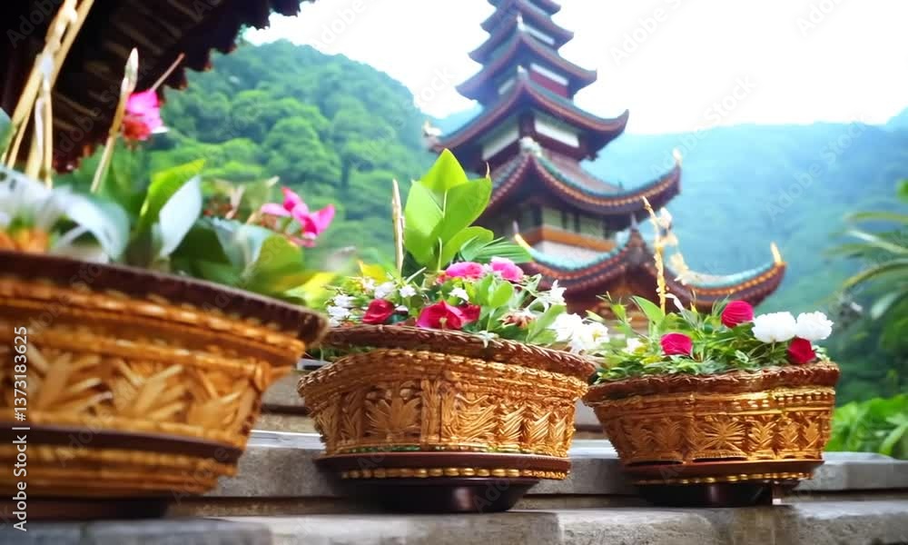 Close-up of Canang Sari, small offering baskets at a temple in Ubud, Bali