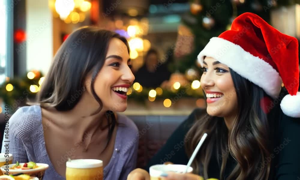 Women friends laugh together telling stories wearing Santa hats in a cafe at night