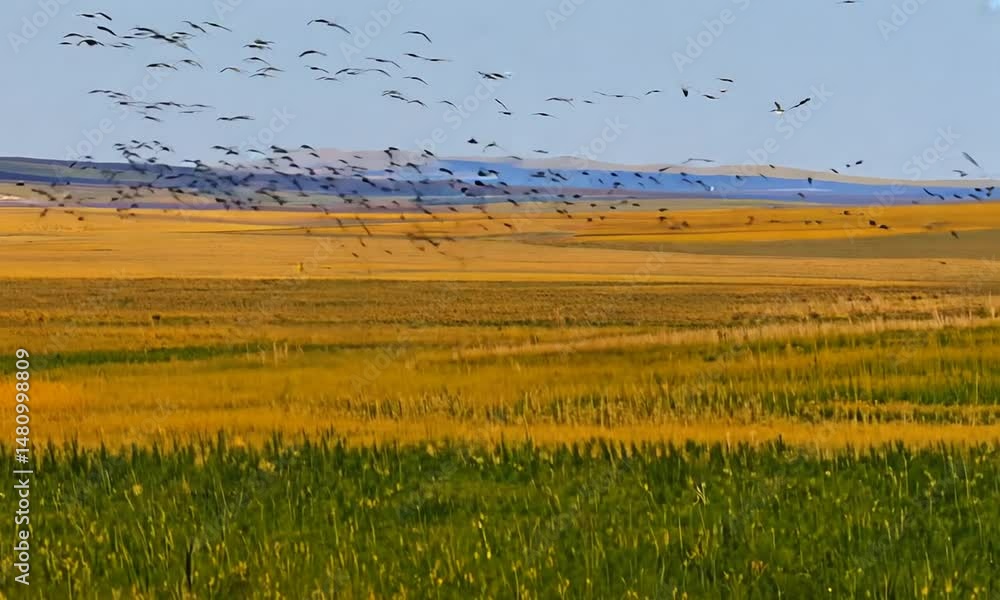 Grassland and birds with blue sky, in Bayingol Mongolian Autonomous Prefecture, xinjiang, China.