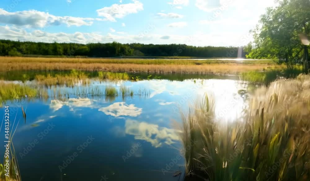 Tranquil wetland landscape with lush vegetation and clear water on a sunny day