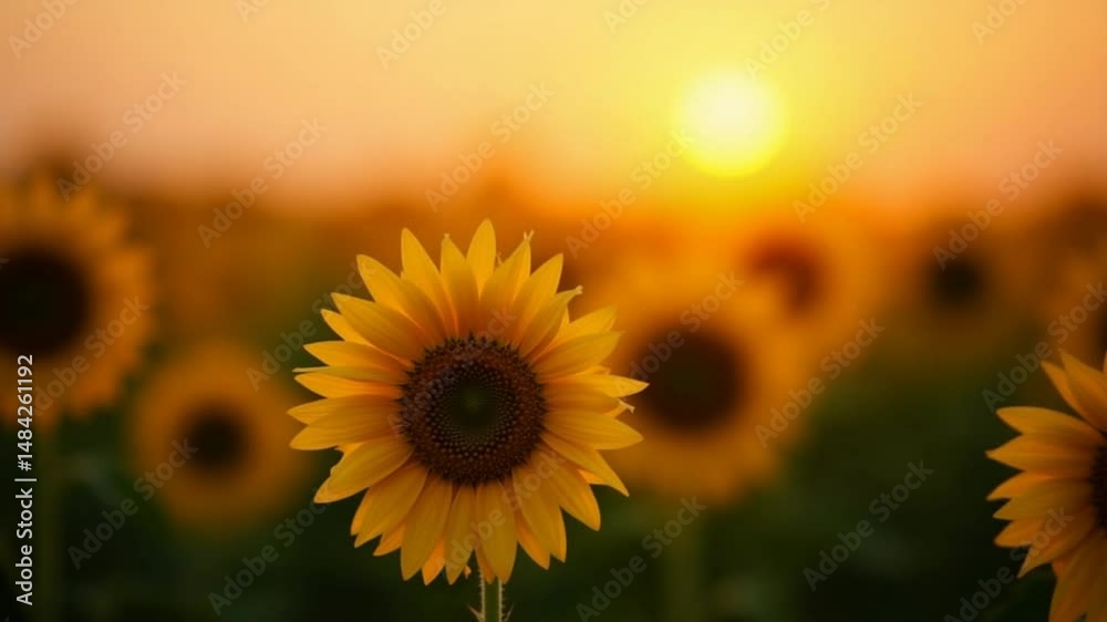 field of blooming sunflowers on a background sunset