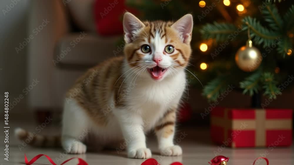 Funny small attractive domestic cats. Playful kitty near christmas tree. Vertical