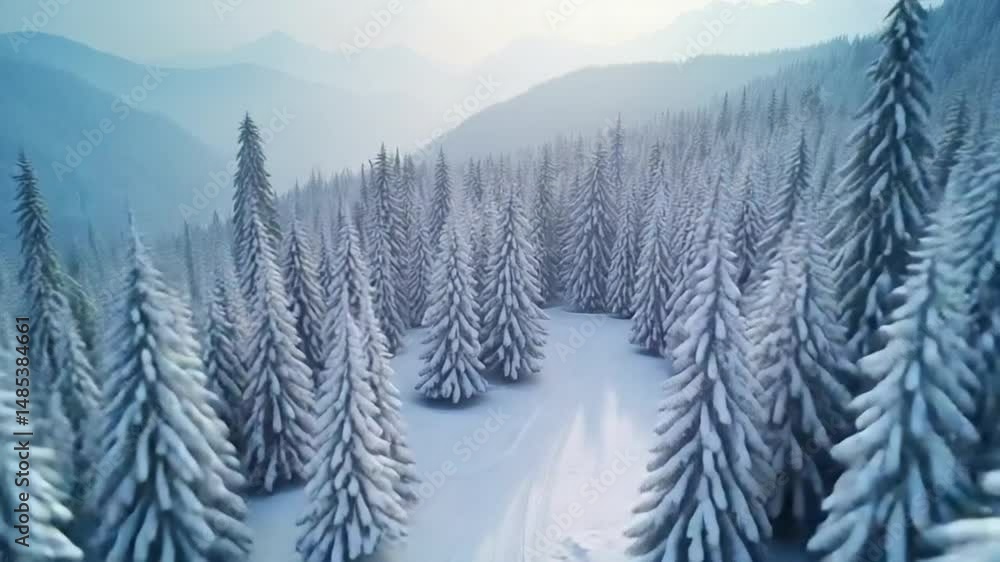 Cinematic FPV drone flight overt beautiful snow-covered winter mountain forest.