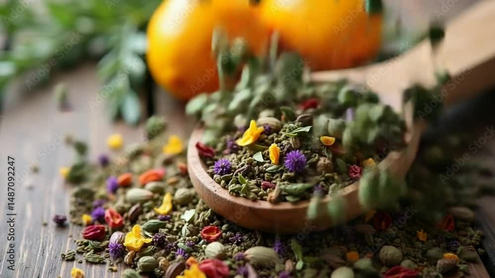 Herbal tea blend with dried flowers and leaves on a wooden surface