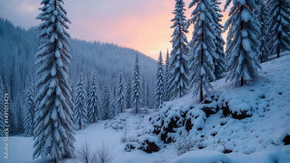 Winter forest landscape with snow covered trees and rocky terrain at dawn