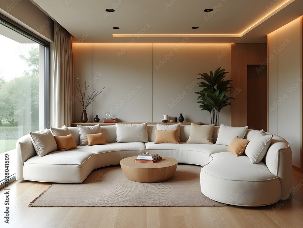 A living room with a large circular couch and a coffee table
