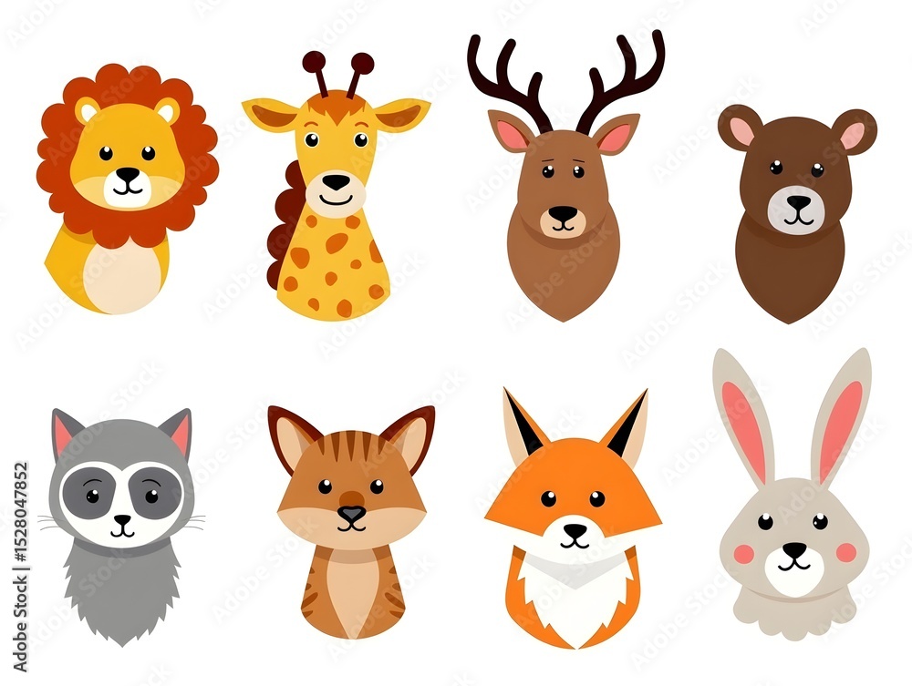 Nine Wildlife Animal Head Portraits Lion, Giraffe, Bear, Deer, Owl, Cat, Fox, Rabbit