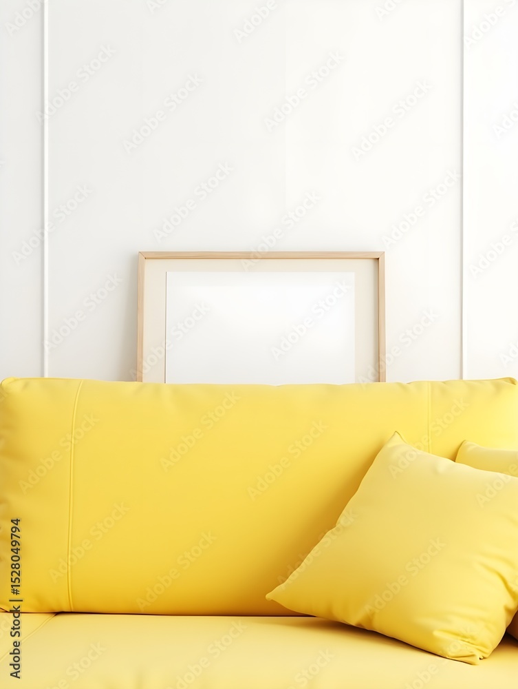 A yellow couch and a picture frame in front of a white wall