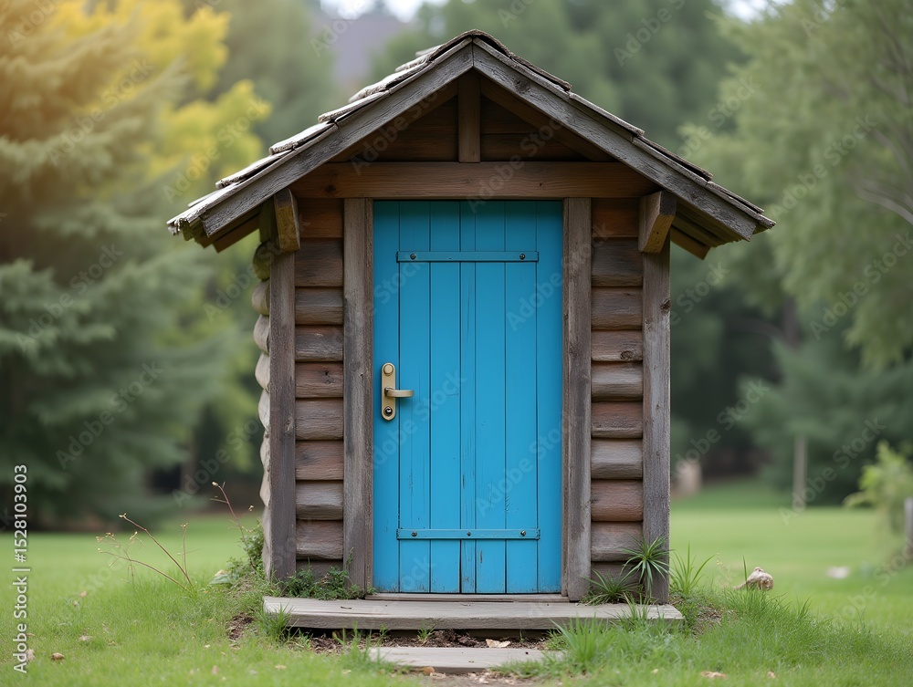 A small wooden house with a blue door