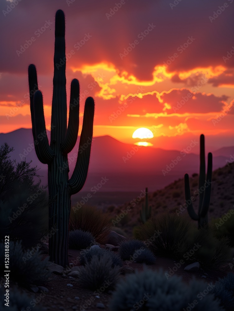 Cactus in Desert Landscape with Dramatic Sunset and Colorful Sky