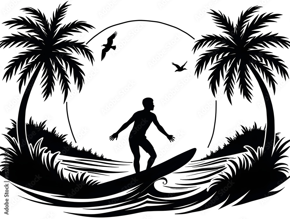 Silhouette scene surfer atop board, framed