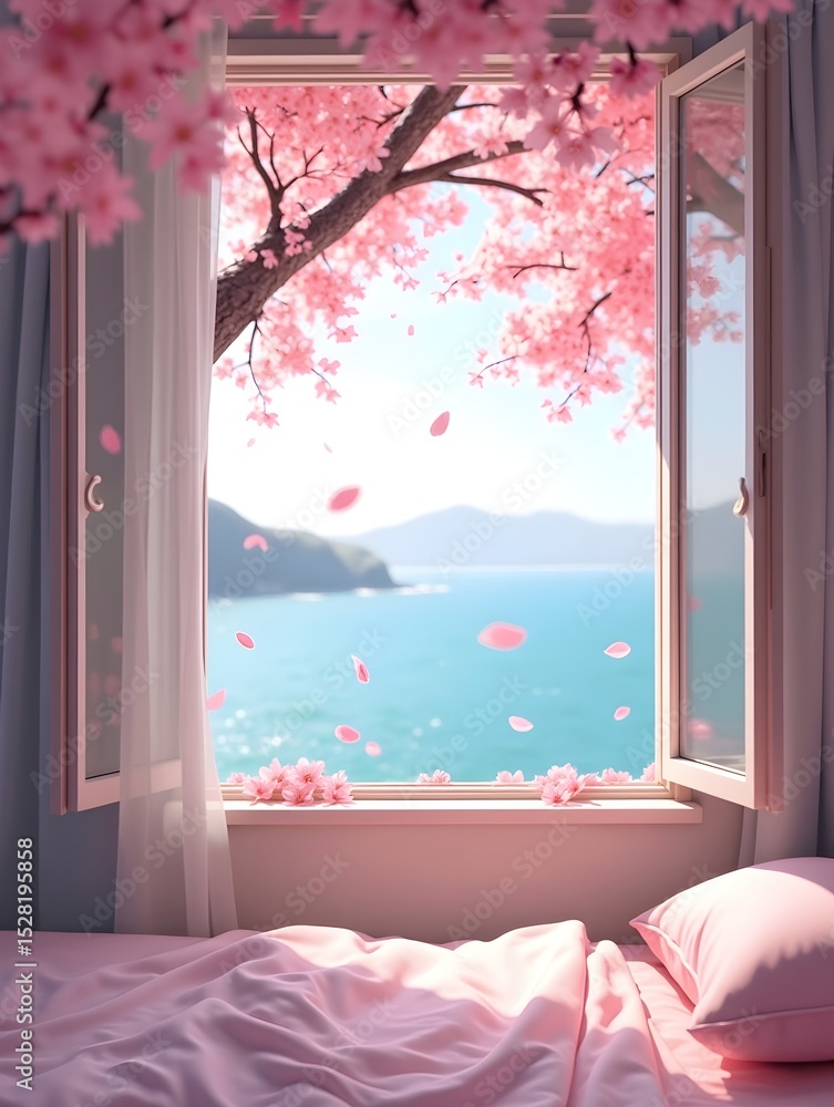 Pink petals falling from cherry blossom tree outside bedroom window overlooking the sea