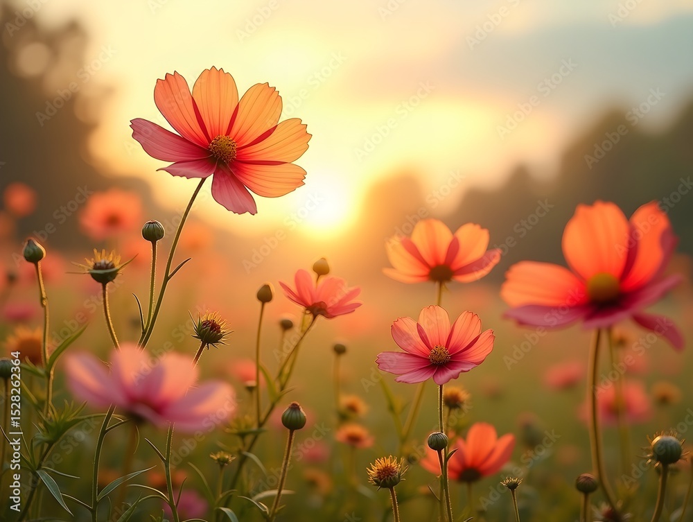 Cosmos stems wave through meadow spaces in autumn breezes, wallpaper
