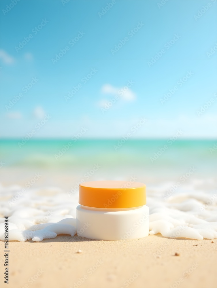 Sunscreen cream jar on sandy beach with ocean waves and blue sky backdrop