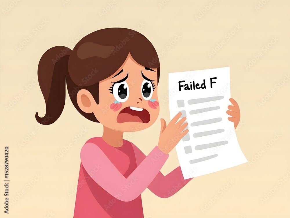 Crying girl holding failed exam paper with grade F in pink shirt illustration