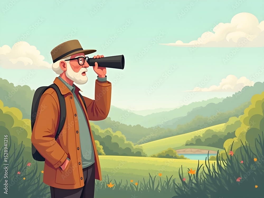 Elderly man birdwatching with binoculars in outdoor nature setting illustration