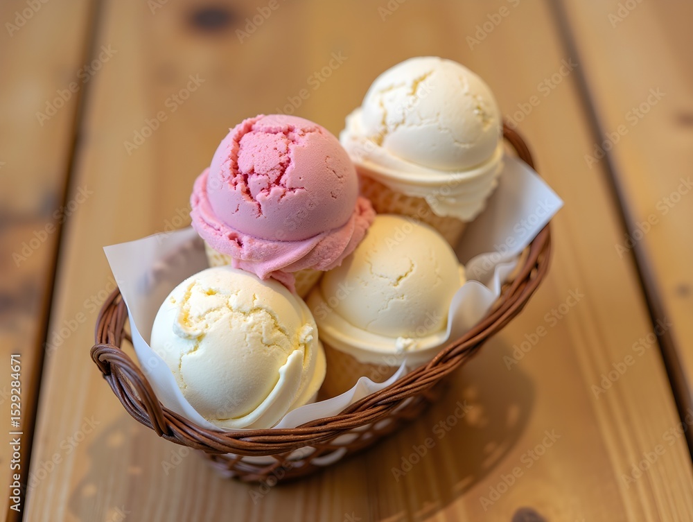 Four ice cream cones stacked in a basket on wooden table
