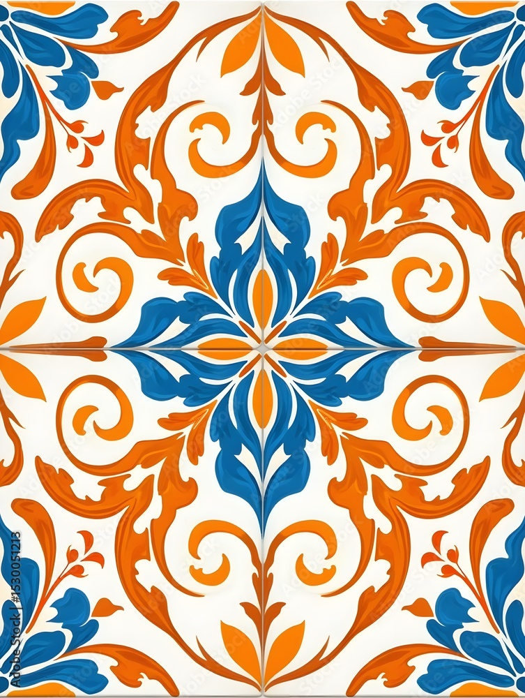 Abstract Geometric Orange Blue Floral Pattern Tile Design