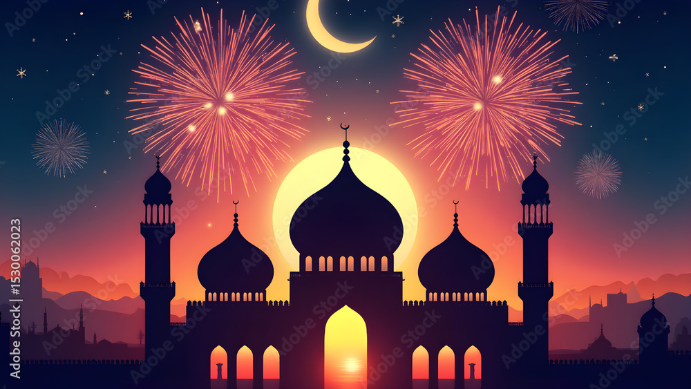 Eid Mubarak Celebration Banner Featuring Mosque and Vibrant Fireworks