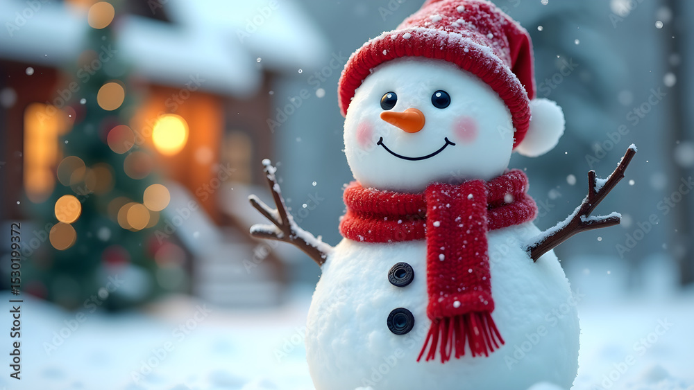 A snowman in a red hat and scarf standing in the snow in front of a house with a christmas tree