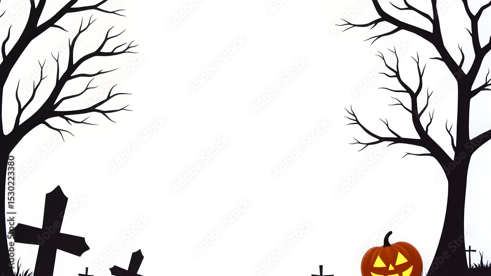 Halloween frame with spooky trees, pumpkins and graveyard design on white background.