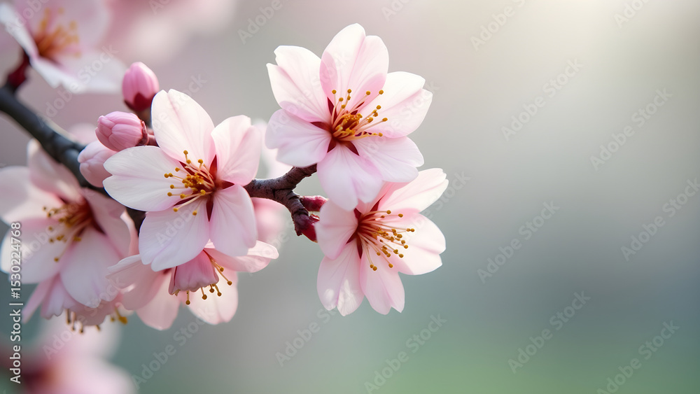 Spring Blossoming Tree Branch and Flowers on Blurry Background