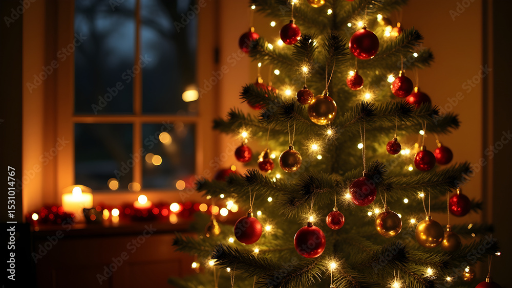 Beautifully decorated Christmas tree with sparkling lights and ornaments in a cozy indoor setting