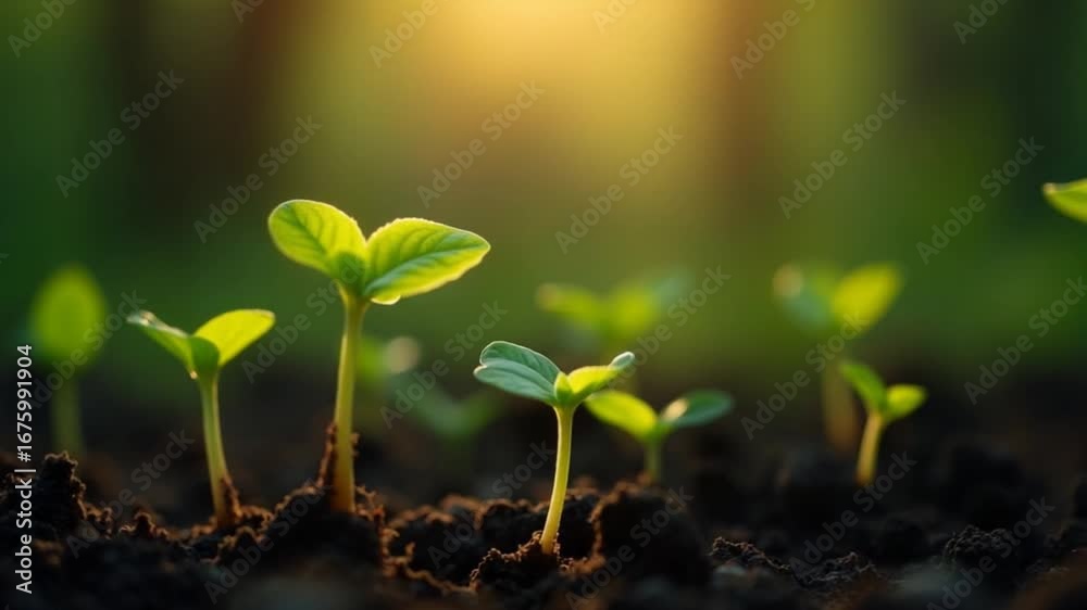 Newly sprouted green seedlings glisten under a soft glow, surrounded