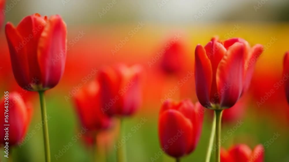 red tulips swaying in the wind, field of flowers, festive background