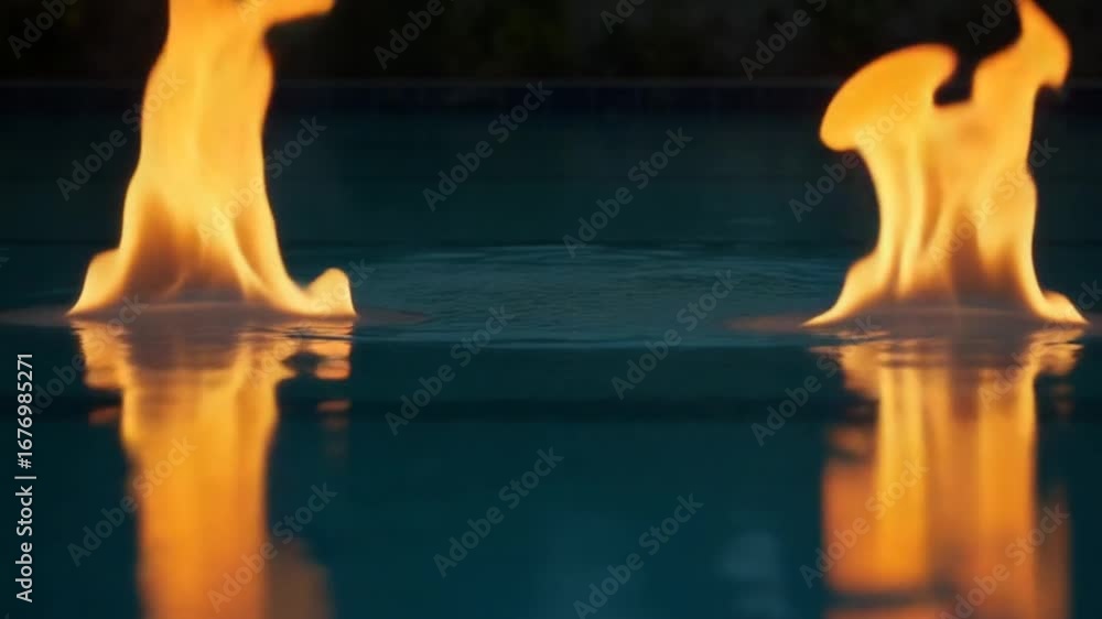 A fire is reflected in the water of a pool of water