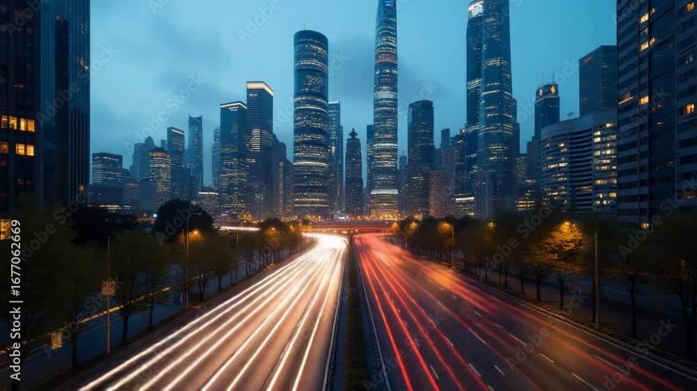 Time lapse of modern futuristic urban city skyline buildings and road cars traffic