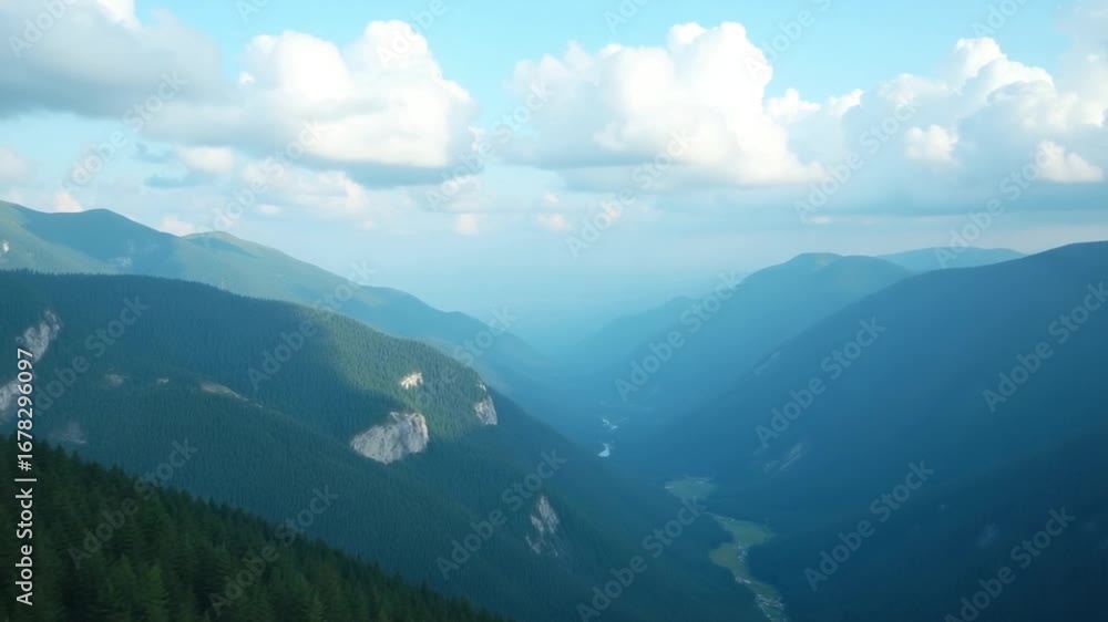 green forested mountains with white clouds on blue sky above, drone hyperlapse
