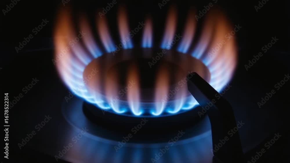 Burning the gas on the stove. Close up shot of fire from gas kitchen stove